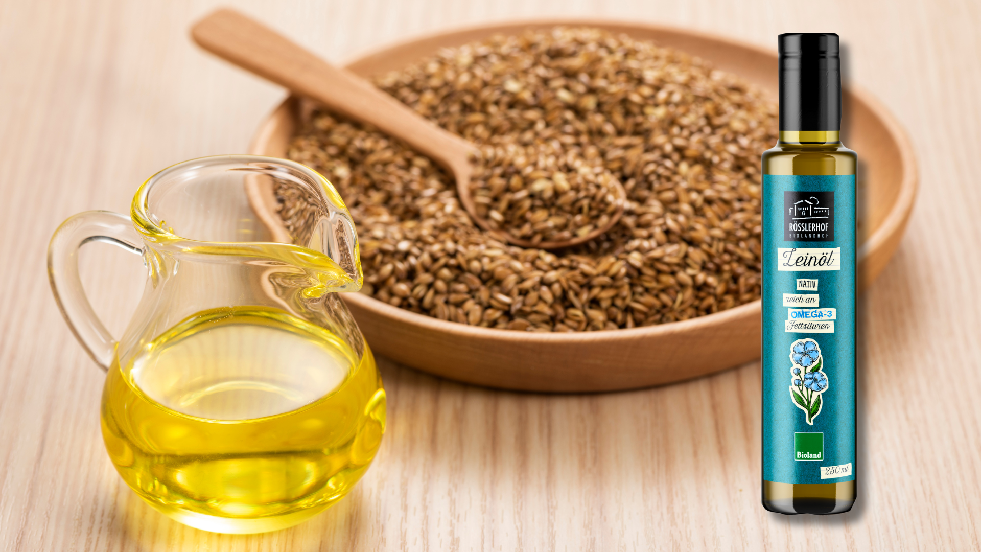 The cold-pressed linseed oil from Rösslerhof is a true treasure from nature. Extracted from high-quality, regionally grown flaxseed, it contains a particularly high amount of polyunsaturated fatty acids – above all the valuable omega-3 fatty acid alpha-linolenic acid (ALA). In its freshly pressed form, it has a mild, nutty flavor and impresses with its golden-yellow color and fine consistency.